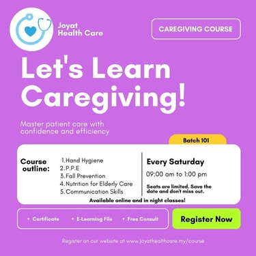 Purpose: To provide participants with fundamental knowledge and skills in elderly caregiving, this course aims to create a solid foundation for further learning and encourage enrollment in more advanced courses. The purpose of learning this course is to equip healthcare professionals and self home support with essential skills to deliver high-quality, safe, and effective care for elderly individuals. By completing this course, participants will be well-prepared to provide comprehensive and compassionate care, ensuring the well-being and safety of elderly individuals under their care.