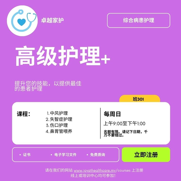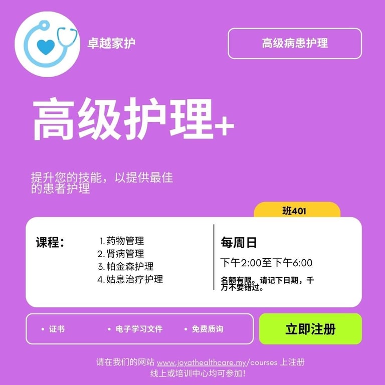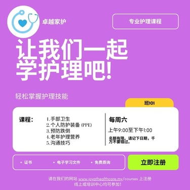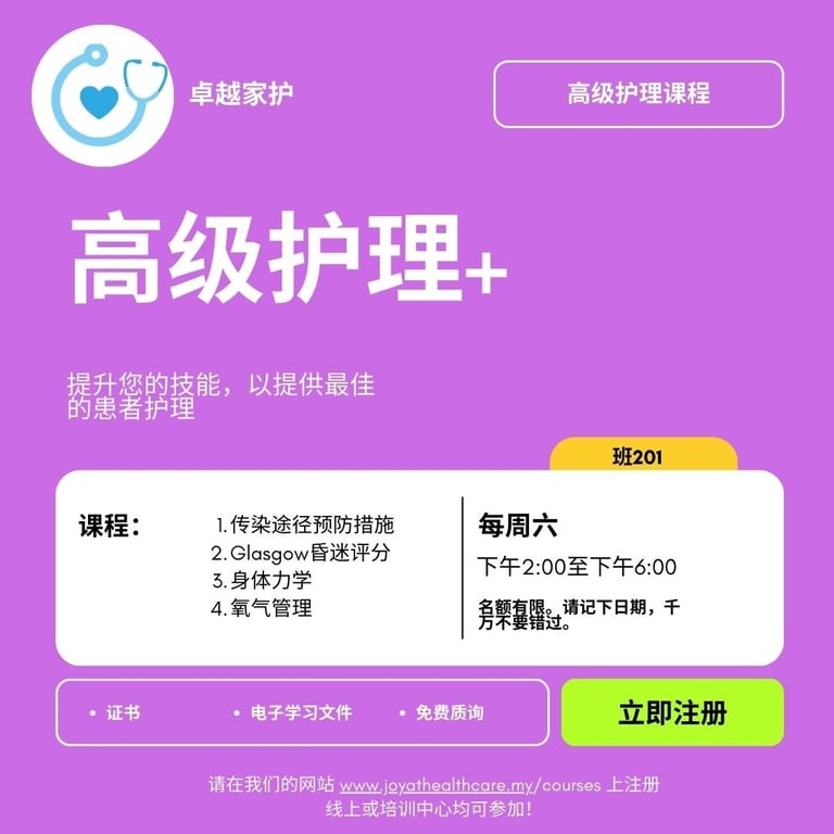 本课程提供基础护理技能培训,涵盖基本的患者照护操作,包括个人卫生、行动协助及生命体征监测,旨在让学员掌握开展有效且充满关怀的护理所需的核心技能。